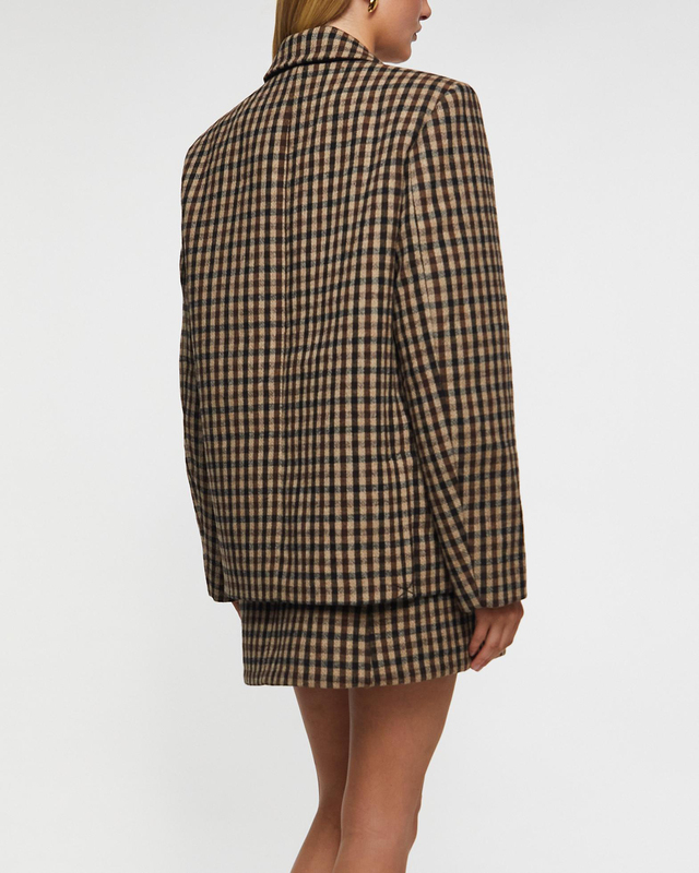 Blazer Check Wool Mix Oversized from Ganni. This blazer features a checked print, a collar, notched lapels, and a front closure with two buttons. The blazer has a GANNI logo on the sleeve. The product is under the W Sustain category as it is made of sustainable materials.