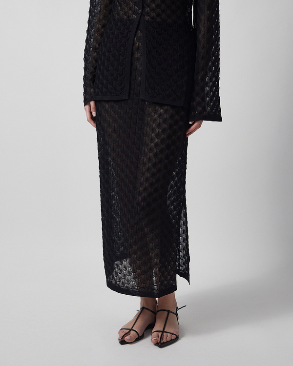 Cardigan Ayla Pointelle Knitted from Malina. A knitted pointelle cardigan with front button closure. Designed for a relaxed fit with a defined waist, wide sleeves, and a deep V-neckline for a refined yet effortless silhouette.