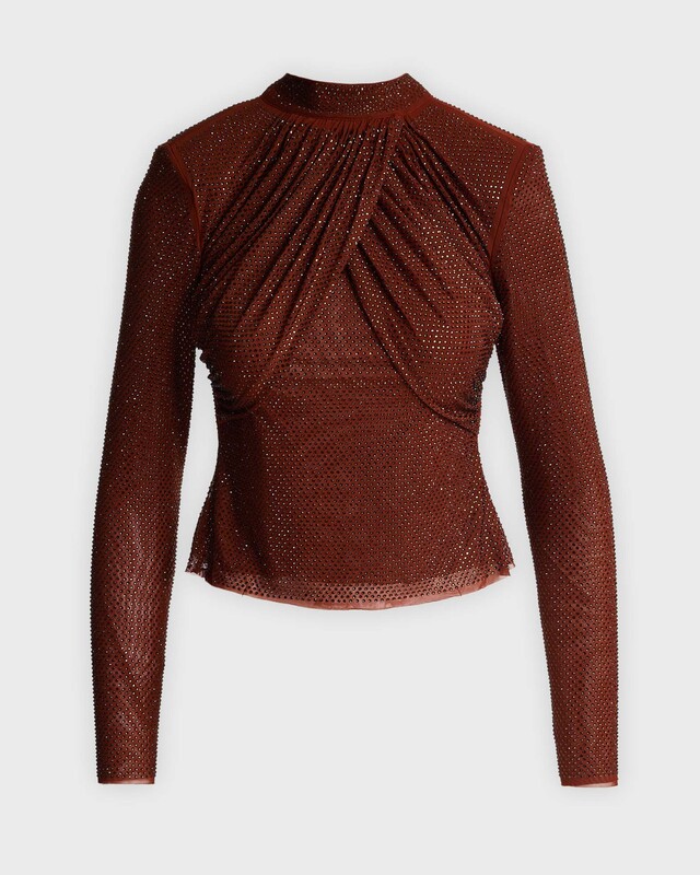 Top Brown Rhainstone Mesh by Self-Portrait. Trendy top in a rhinestone embellished mesh, this top's wrap details and material give it a sculpted feel. The top is normal in size and made of a stretchy material. Closes at the back with a zipper, and has an exaggerated shoulder with shoulder pads. Combine with denim and a pair of heels for a complete look.