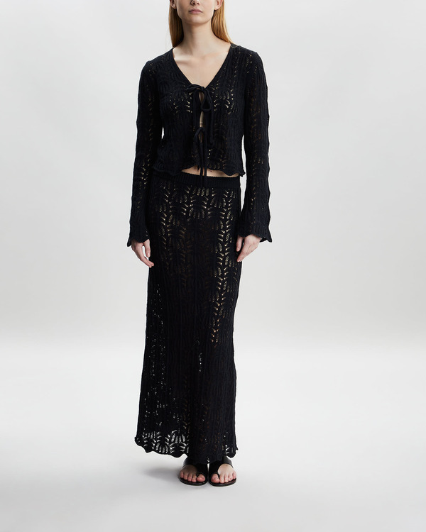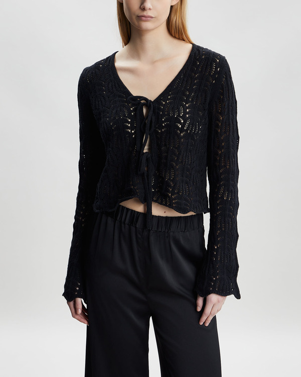 Vest Egypt Crochet from The Garment. Trendy top made from a blend of cotton and linen. The top is crocheted and designed with a V-neckline at the front with tie details and an uneven hem. The product is available under the W Sustain category as it is made from sustainable materials.