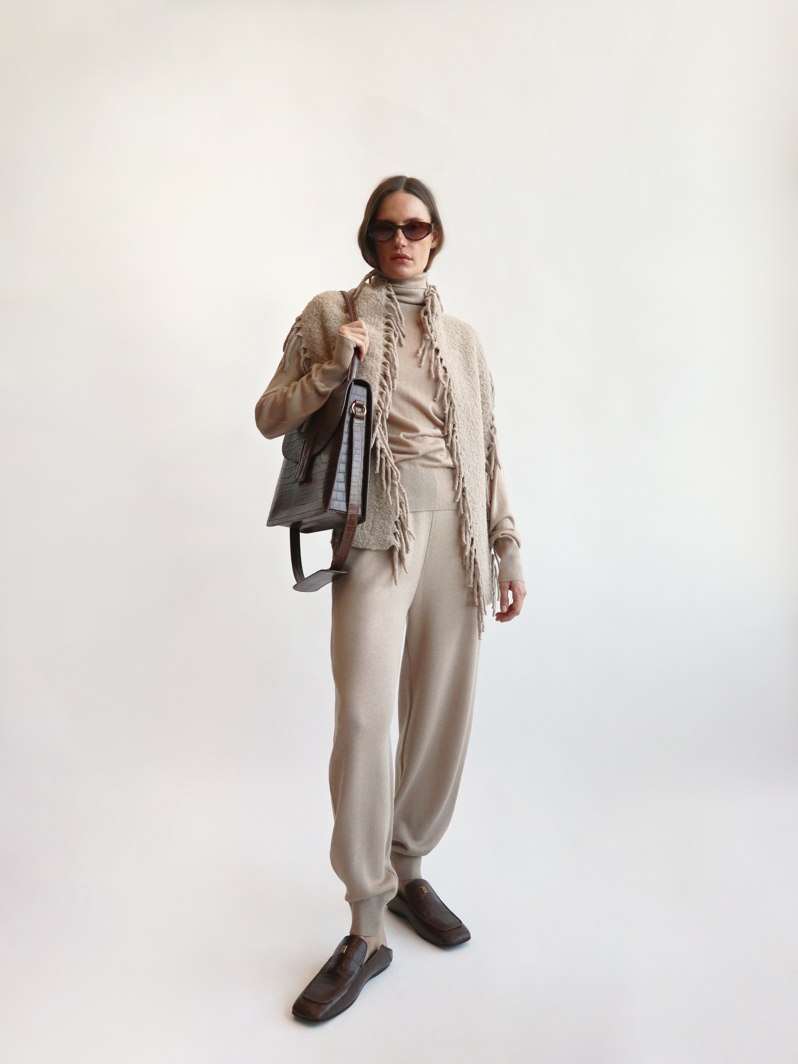 Outerwear takes center stage in this collection, seamlessly combining warmth and style. Key pieces include a faux-fur maxi coat that adds off-beat glamour and a reversible shearling jacket in brown with bold cuffs and a statement collar for a chic twist. Knitwear is also essential in the Fall 2024 collection, blending comfort and elegance. Mohair-wool sets with cropped cardigans and mini skirts offer a playful touch, while a cable-knit sweater dress paired with a matching scarf creates a cozy, stylish look.