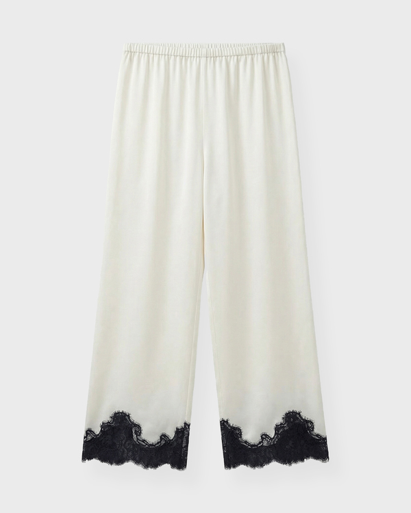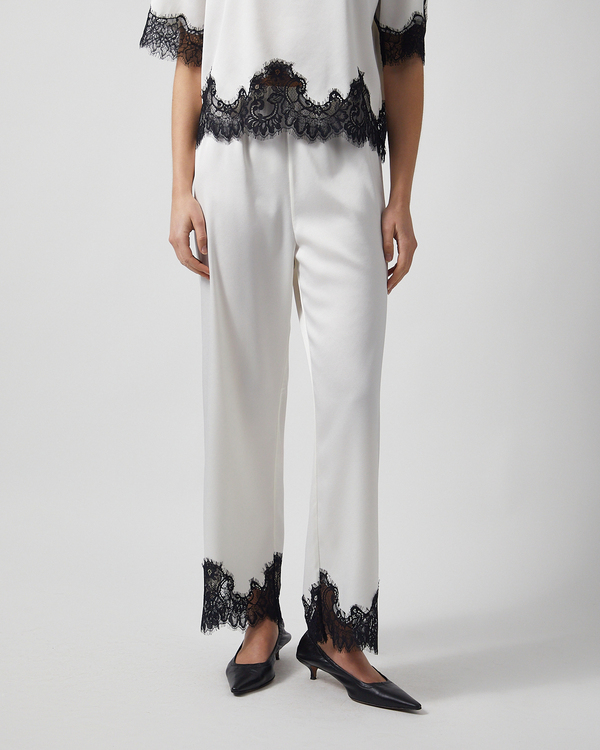 Top Canary Lace from Wakakuu Icons. An elegant short-sleeved top with a clean, minimal silhouette. Designed with subtle shoulder pads for a defined shape, a round neckline and delicate lace trim at the sleeves and hem for a feminine contrast. Style with the Rayna Lace trousers or the Lola Shorts from Wakakuu Icons for a considered, sophisticated look.