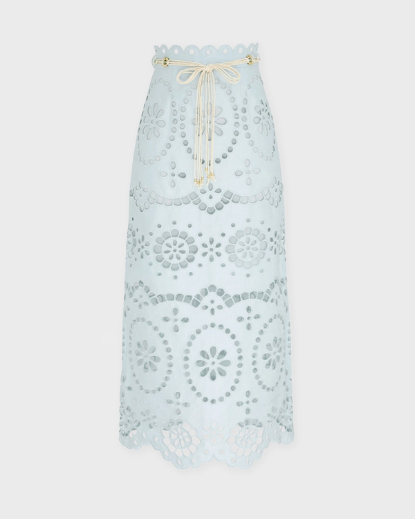 Blouse Awaken Embroidered Bodice from Zimmermann. A cropped linen top with short sleeves and defined cuffs adorned with scalloped edges. The design features an invisible zip closure at the back and intricate all-over embroidery that adds an exclusive touch. The top comes with a separate bralette for a complete and refined silhouette.