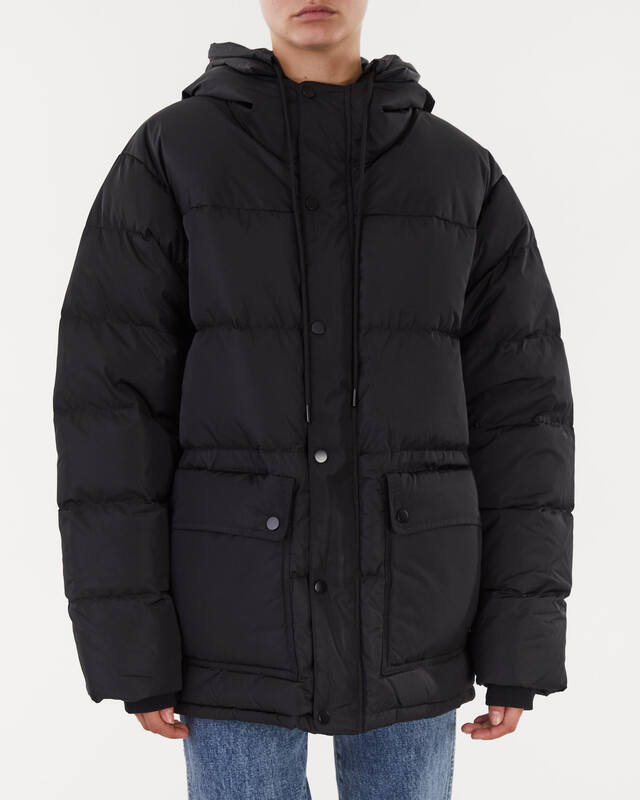 Jacket Icons Puffer from Wakakuu Icons. Trendy down jacket with a straight fit. Medium length design with a high neck and horizontal quilting. The jacket has pockets on the front and hood with a drawstring. Closes with a hidden two-way zipper and buttoning at the front. Knitted cuffs.