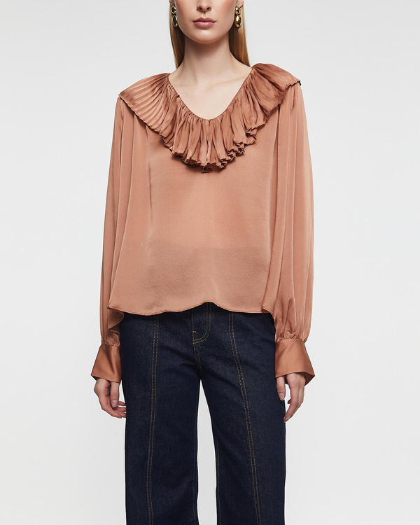 The Delphine High Rise Jeans from Ulla Johnson. Made from dark indigo denim with contrast stitching. The high waist creates a polished finish, while twisted gold details add an elegant touch.