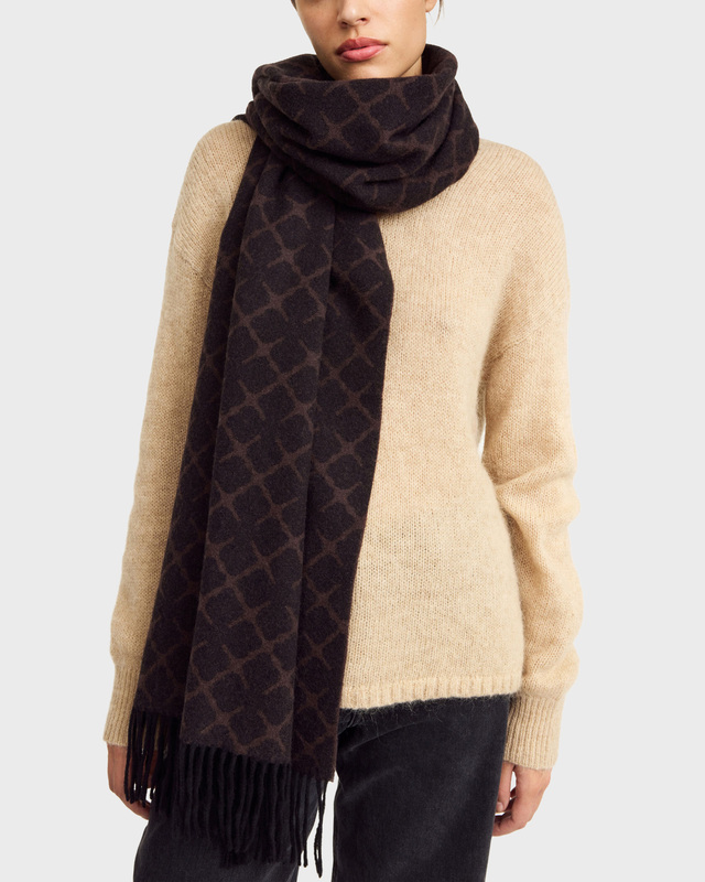 Scarf Augustina från Anine Bing. Denna klassiska halsduk är tillverkad i en lyxig kvalitet av 100 % ull som ger både värme och mjuk komfort. Den tidlösa designen kompletteras av en diskret läderpatch präglad med Anine Bing-logotypen, vilket tillför en elegant signaturdetalj. Ett självklart accessoarval för kalla dagar.
