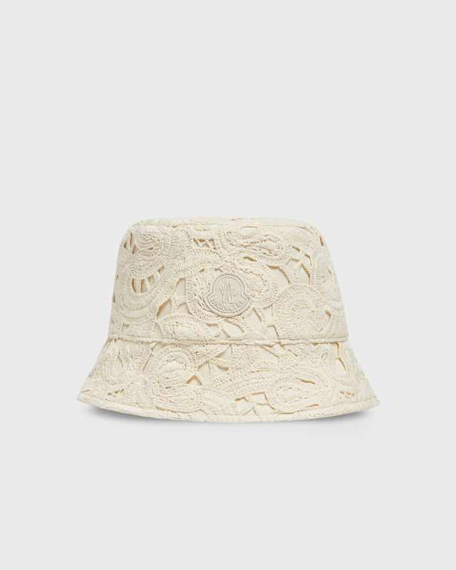 Bucket Hat Macramé från Moncler. En stilren solhatt i ivoryfärgat bomullsgarn med vackert handknutet macramémönster. Den luftiga designen kombinerar hantverk och elegans, perfekt för sommardagar med både stil och skugga. En exklusiv accessoar som lyfter varje semesterlook.