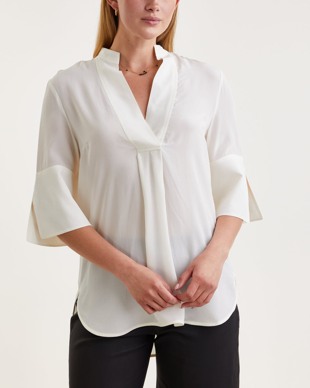 Blus Flayia från By Malene Birger. Elegant blus som är tillverkad ett ekologiskt silkesmaterial. Denna blus är designad med en böjd fåll, mandarinkrage och vidare ärmar som slutar i armbågslängd. Blusen har en avslappnad passform som ger en bekväm och smickrande silhuett. Produkten finns under kategorin W Sustain eftersom att den är tillverkad av hållbara material.
