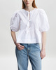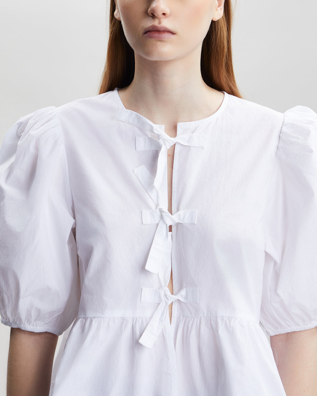 Blus Cotton Poplin Peplum från Ganni. Denna poplinblus är tillverkad av ekologisk bomull. Blusen har en öppen rund halsringning med knytning och kännetecknande puffärmar med elastiska kanter. Designad för en avslappnad passform. Produkten tillhör kategorin W Sustain eftersom den är tillverkad av hållbara material.