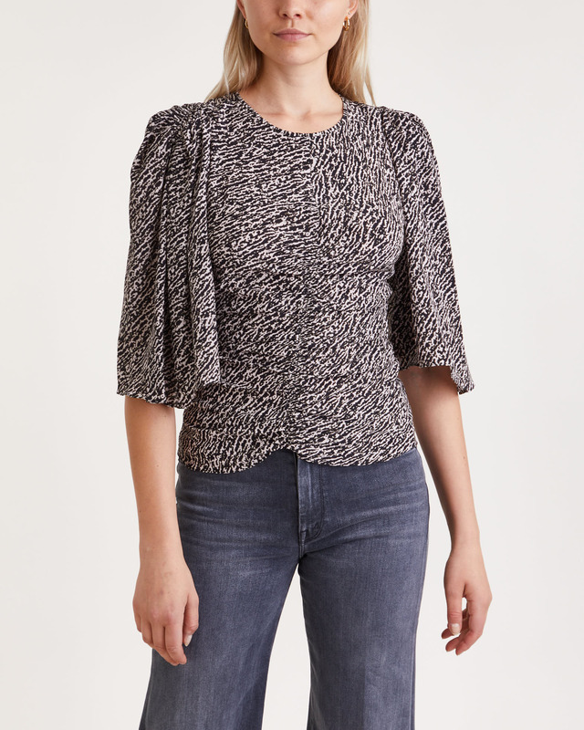 Blus Geza från Isabel Marant. Elegant sidenblus med korta ärmar, ett stilfullt och mångsidigt tillskott till din garderob. Denna blus har ett vackert mönster på lyxigt sidenmaterial, vilket ger en elegant touch till vilken outfit som helst. Framsidan av blusen är dekorerad med veck, vilket förstärker dess visuella attraktivitet och ger en smickrande passform.