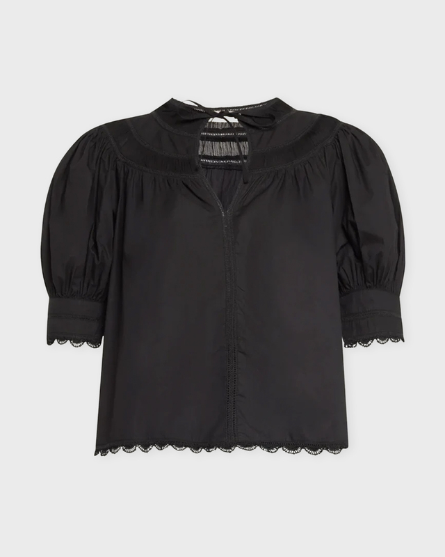 Topp Dylan från Ulla Johnson. En älskad silhuett, Dylan-toppen är tillverkad i vattenvaskad poplin som pryds av spetskantade volangdetaljer i blombladform. Denna gröna kortärmade topp har en lös passform, inramad av våra karakteristiska puffärmar, och avslutas med delikat stegsöm på framsidan och ärmsluten. Den stängs med bindband vid nyckelhålet fram.