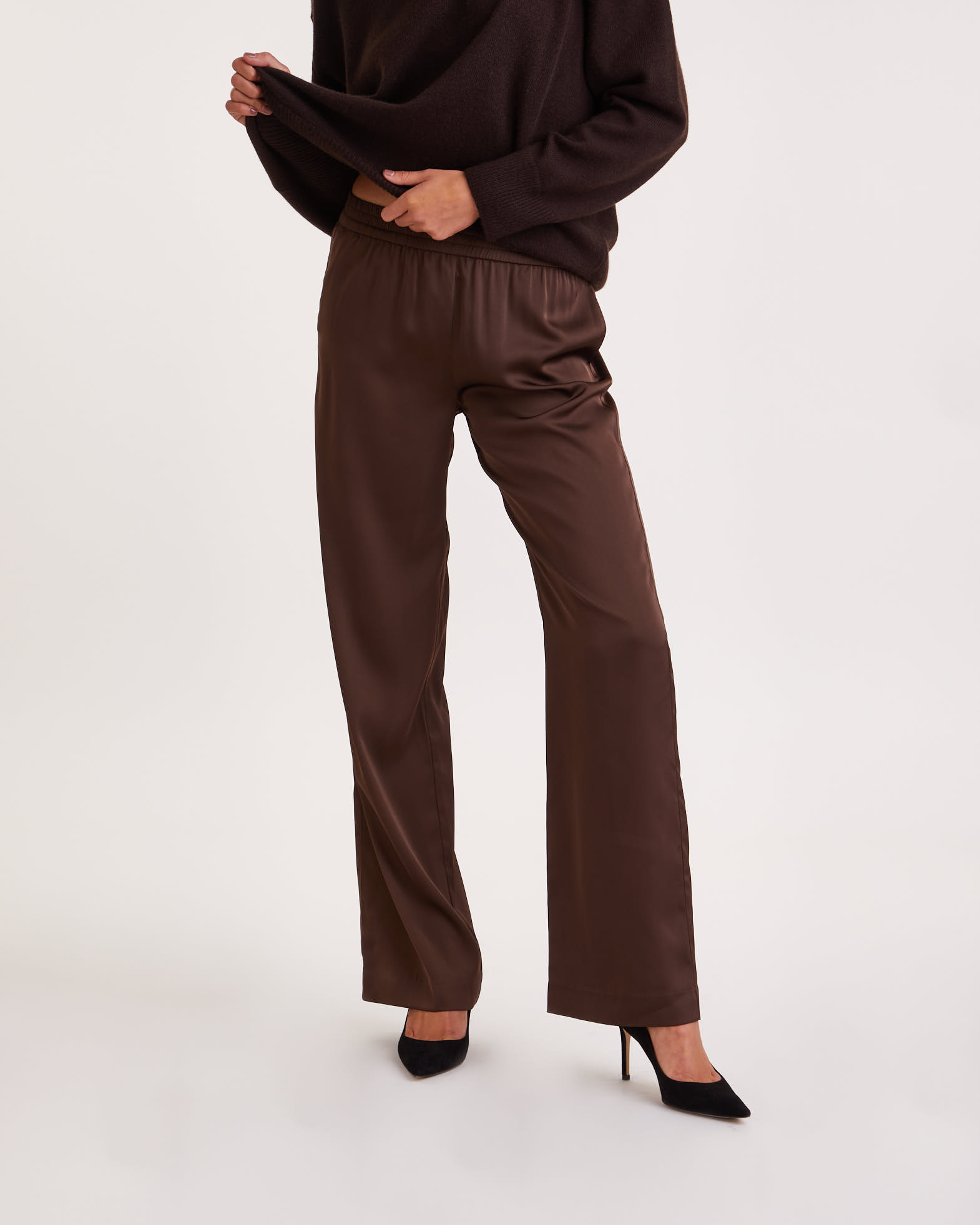 Blus Maria Satin från Wakakuu Icons. Elegant blus i en skjortdesign. Blusen är tillverkad av ett något tyngre satinliknande tyg. Skjortan har två fickor framtill och en klassisk krage. Skjortan är något längre bak och har vida ärmslut med slits. Försluts med gömd knäppning. Skjortan har en avslappnad passform och kommer nu i två nya säsongsbetonade färger, brunt och navy.