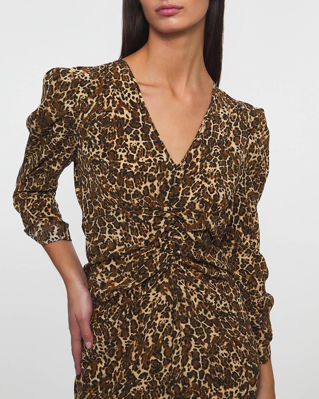 Klänning Albini från Isabel Marant. Elegant V- ringad klänning i ett trendigt leopard mönster. Klänningen har rysch i midjan som skapar en smickrande passform. Rysch vid ärmar, strukturerade ärmar och längre fall baktill. Bär tillsammans med ett par neutrala sandaler eller högklackade skor för en bohemisk och elegant look.